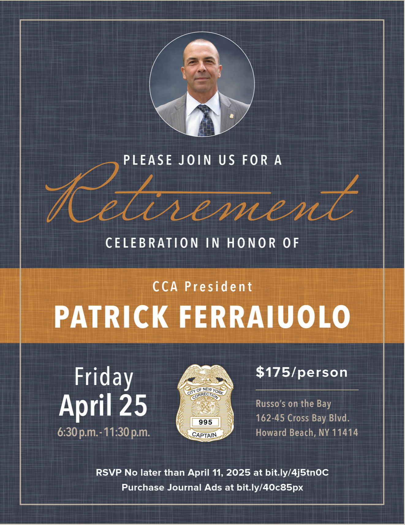 Join us for a special night of celebration in honor of Correction Captains’ Association President Patrick Ferraiuolo’s retirement! Let’s come together to recognize his dedication and service.