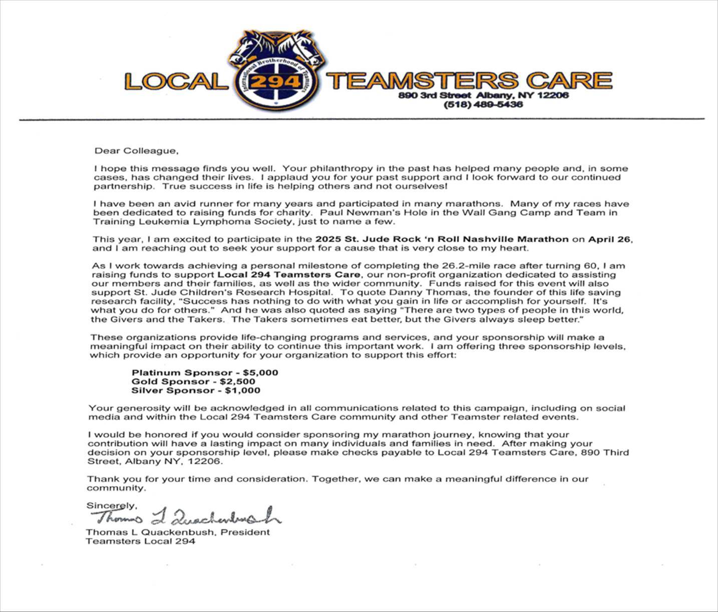 As I work towards achieving a personal milestone of completing the 26.2-mile race after turning 60, I am raising funds to support Local 294 Teamsters Care, our non-profit organization dedicated to assisting our members and their families, as well as the wider community. Funds raised for this event will also support St. Jude Children's Research Hospital. To quote Danny Thomas, the founder of this life saving research facility, "Success has nothing to do with what you gain in life or accomplish for yourself. It's what you do for others." And he was also quoted as saying "There are two types of people in this world, the Givers and the Takers. The Takers sometimes eat better, but the Givers always sleep better."